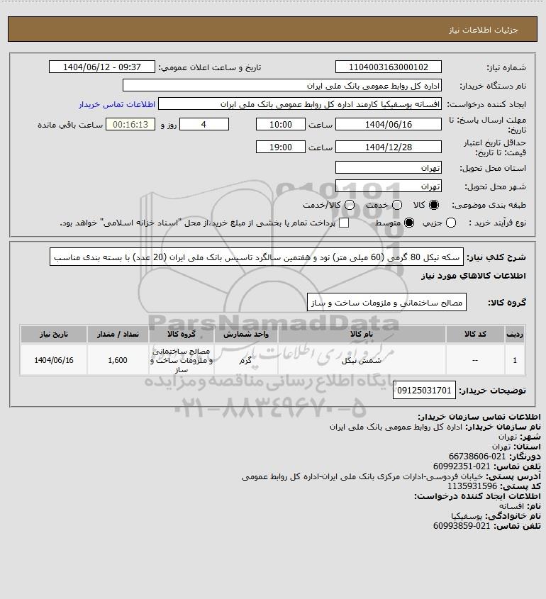 استعلام سکه نیکل 80 گرمی (60 میلی متر) نود و هفتمین سالگرد تاسیس بانک ملی ایران (20 عدد) با بسته بندی مناسب, استعلام سکه نیکل 80 گرمی (60 میلی متر) نود و هفتمین سالگرد تاسیس بانک ملی ایران (20 عدد) با بسته بندی مناسب