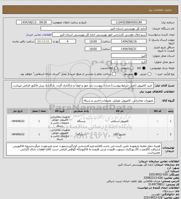استعلام بها و موضوع استعلام استعلام خرید کامپیوتر (طبق شرایط پیوست) مدارک پیوست باید مهر و امضا و بارگذاری گردد. بارگذاری پیش فاکتور الزامی میباشد به اطلاع کلیه شرکت‌ها و افراد متخصص واجد شرایط می‌رساند، آگهی گذار در نظر دارد از طریق استعلام بها، نسبت به انتخاب و دریافت پیشنهادات اقدام نماید. این استعلام با کد آگهی ثبت شده در سامانه خبرگزاری پارس نماد : 9493899 منتشر شده است. مشخصات استعلام : تاریخ شروع استعلام: 1404/06/12 آخرین مهلت ارسال پیشنهاد قیمت : 1404/06/16 و محل اجرای پروژه : استان مناقصات استان البرز میباشد. استعلام قیمت مورد درخواست : استعلام خرید کامپیوتر (طبق شرایط پیوست) مدارک پیوست باید مهر و امضا و بارگذاری گردد. بارگذاری پیش فاکتور الزامی میباشد با دسته‌بندی‌های تخصصی و گروه های مرتبط : کامپیوتر, استعلام اطلاع رسانی میگردد.