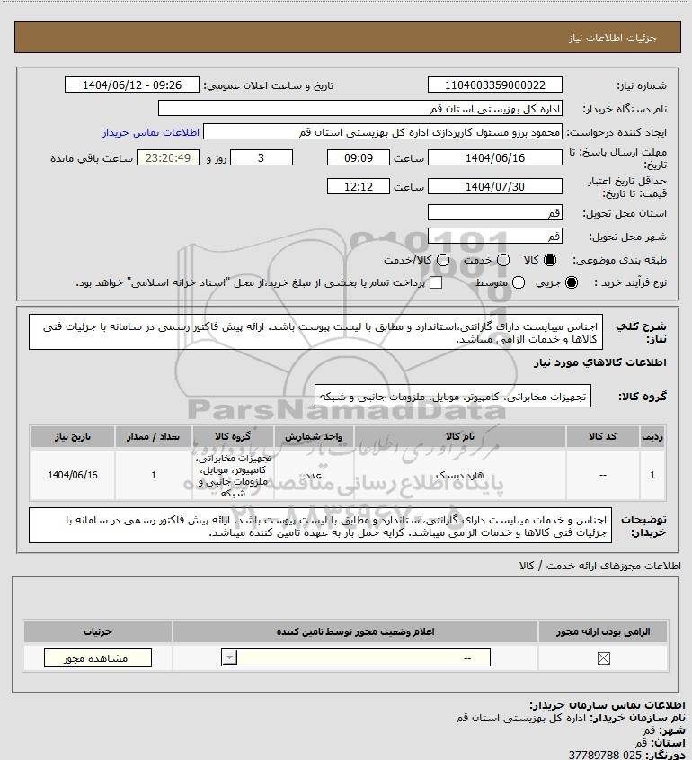 1 -- هارد دیسک عدد تجهیزات مخابراتی، کامپیوتر، موبایل، ملزومات جانبی و شبکه 1 1404/06/16