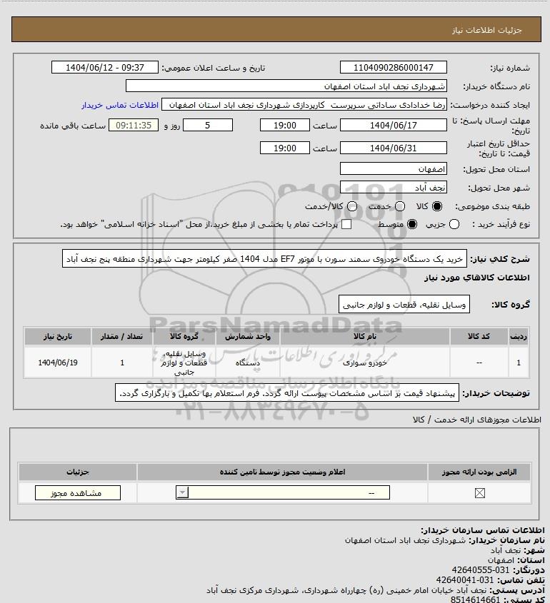 استعلام خرید یک دستگاه خودروی سمند سورن با موتور EF7 مدل 1404 صفر کیلومتر جهت شهرداری منطقه پنج نجف آباد, استعلام خرید یک دستگاه خودروی سمند سورن با موتور EF7 مدل 1404 صفر کیلومتر جهت شهرداری منطقه پنج نجف آباد