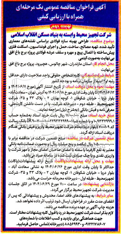 موضوع مناقصه: طراحی، بهینه سازه فولادی بر اساس نقشه های معماری تأیید شده تهیه مصالح ساخت حمل و اجرای فونداسیون اسکلت فلزی پیش ساخته با اتصال پیچ و مهره و سقف عرشه فولادی پروژه برج باغ افق بی نهایت به صورت آیتمی