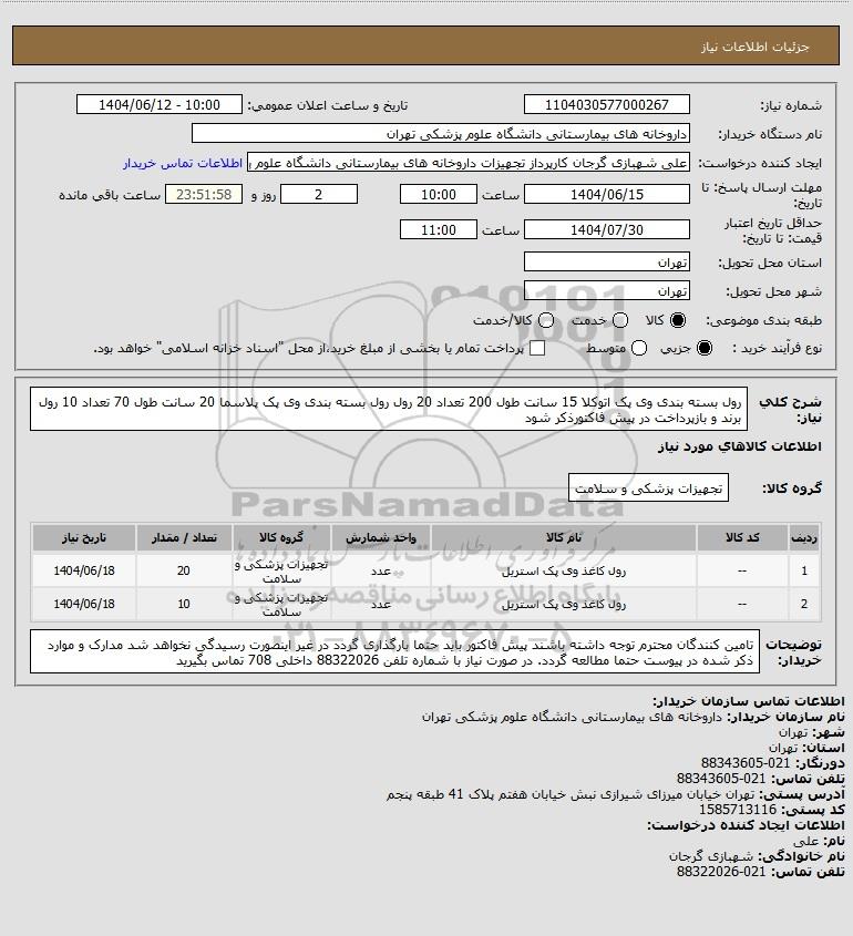 | 2 | -- | رول کاغذ وی پک استریل | عدد | تجهیزات پزشکی و سلامت | 10 | 1404/06/18 |