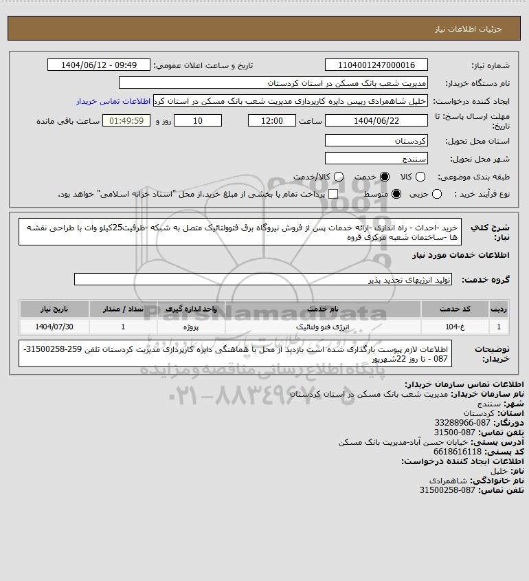 شرح کلی نیاز: خرید -احداث - راه اندازی -ارائه خدمات پس از فروش نیروگاه برق فتوولتائیک متصل به شبکه -ظرفیت25کیلو وات با طراحی نقشه ها -ساختمان شعبه مرکزی قروه