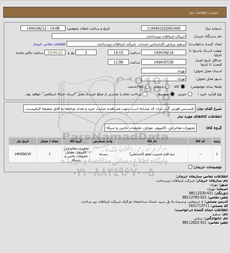 | 1 | -- | نرم افزار مدیریت مجوز (لایسنس) | بسته | تجهیزات مخابراتی، کامپیوتر، موبایل، ملزومات جانبی و شبکه | 1 | 1404/06/19 |