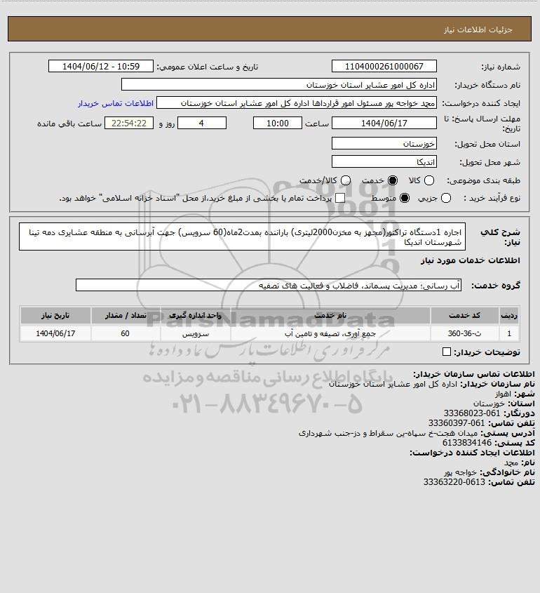 شرح کلی نیاز: اجاره 1دستگاه تراکتور(مجهز به مخزن2000لیتری) باراننده بمدت2ماه(60 سرویس) جهت آبرسانی به منطقه عشایری دمه تینا شهرستان اندیکا