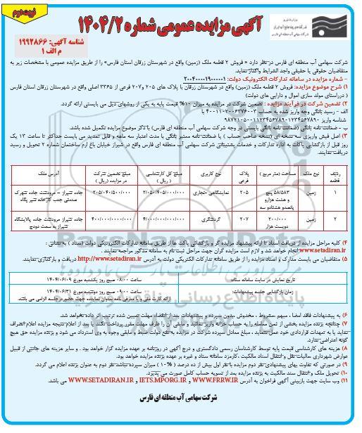مزایده فروش 2 قطعه ملک (زمین) واقع در شهرستان زرقان استان فارس