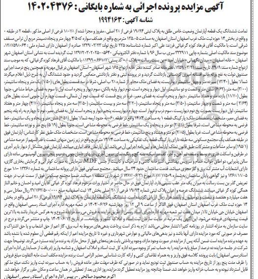 مزایده ششدانگ یک قطعه آپارتمان پلاک ثبتی 19.94 فرعی , مزایده ششدانگ یک قطعه آپارتمان پلاک ثبتی 19.94 فرعی
