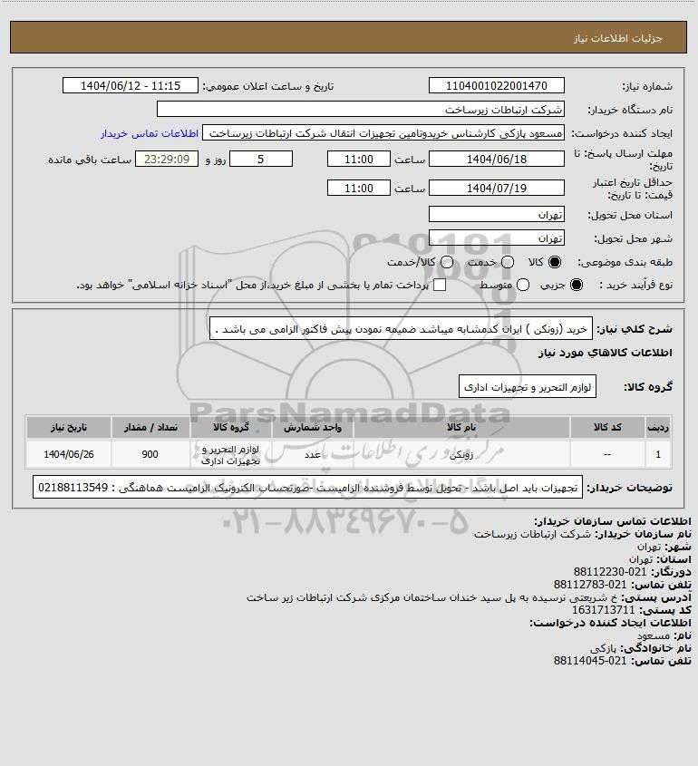 استعلام بها و موضوع استعلام استعلام خرید (زونکن ) ایران کدمشابه میباشد ضمیمه نمودن پیش فاکتور الزامی می باشد . به اطلاع کلیه شرکتها و افراد متخصص واجد شرایط میرساند، آگهی گذار در نظر دارد از طریق استعلام بها، نسبت به انتخاب و دریافت پیشنهادات اقدام نماید. این استعلام با کد آگهی ثبت شده در سامانه خبرگزاری پارس نماد : 9494815 منتشر شده است. مشخصات استعلام : تاریخ شروع استعلام: 1404/06/12 آخرین مهلت ارسال پیشنهاد قیمت : 1404/06/18 و محل اجرای پروژه : استان تهران میباشد. استعلام قیمت مورد درخواست : استعلام خرید (زونکن ) ایران کدمشابه میباشد ضمیمه نمودن پیش فاکتور الزامی می باشد . با دستهبندیهای تخصصی و گروه های مرتبط : نوشت افزار, استعلام اطلاع رسانی میگردد.