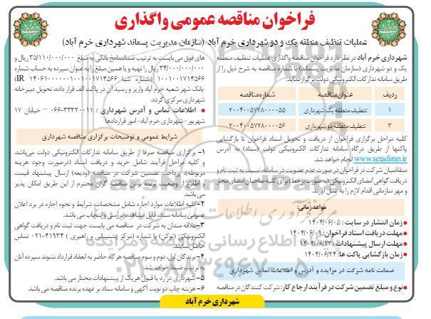 فراخوان مناقصه عمومی واگذاری عملیات تنظیف منطقه یک و دو شهرداری خرم آباد ؟