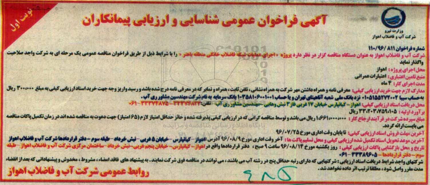 فراخوان اجرای عملیات شبکه فاضلاب خانگی, آگهی فراخوان عمومی شناسایی و ارزیابی پیمانکاران,فراخوان اجرای عملیات شبکه فاضلاب خانگی