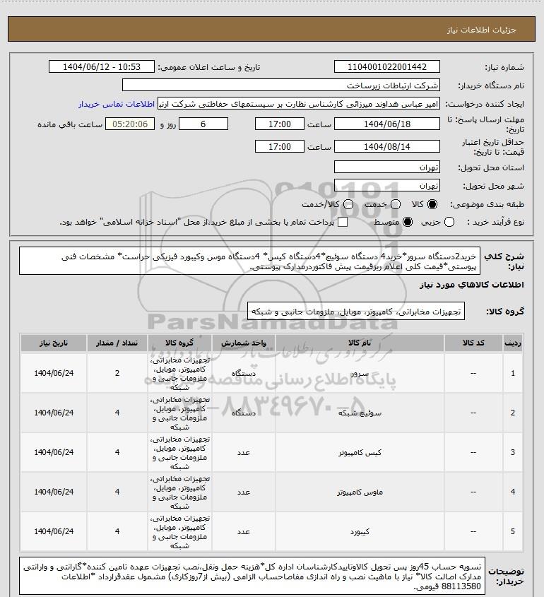 شرح کلی نیاز: خرید2دستگاه سرور*خرید4 دستگاه سوئیچ*4دستگاه کیس* 4دستگاه موس وکیبورد فیزیکی حراست* مشخصات فنی پیوستی*قیمت کلی اعلام ریزقیمت پیش فاکتوردرمدارک پیوستی.