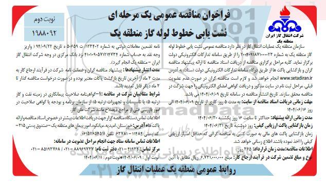 سازمان منطقه یک عملیات انتقال گاز در نظر دارد مناقصه عمومی نشت یابی خطوط لوله گاز منطقه یک به شماره 2004091871000022 را از طریق سامانه تدارکات الکترونیکی دولت برگزار نماید. کلیه مراحل برگزاری مناقصه از دریافت استاد مناقصه تا ارائه پیشنهاد مناقصه گران و بازگشایی پاکت ها از طریق درگاه سامانه تدارکات الکترونیکی دولت (ستاد) به آدرس سایت ستاد ایران انجام خواهد شد و لازم است مناقصه گران در صورت عدم عضویت قبلی مراحل ثبت نام در سایت مذکور و دریافت گواهی امضای الکترونیکی را جهت شرکت در مناقصه محقق سازند. تاریخ انتشار مناقصه در سامانه تاریخ 1404.06.09 می باشد.