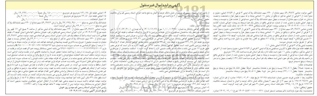 مزایده فروش ملک به پلاک ثبتی 3 فرعی از 8254 اصلی به مساحت 142.55 مترمربع
