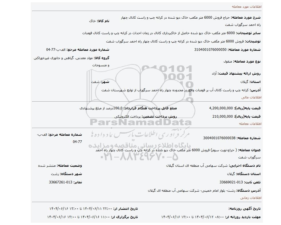 | شرح مورد معامله: حراج فروش 6000 متر مکعب خاک دپو شده در کرانه چپ و راست کانال چهار راه احمد سرگوراب شفت | نام کالا: خاک | |