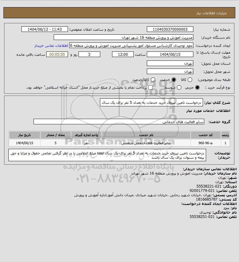 شرح کلی نیاز: درخواست تامین نیروی خرید خدمات به تعداد 5 نفر برای یک سال