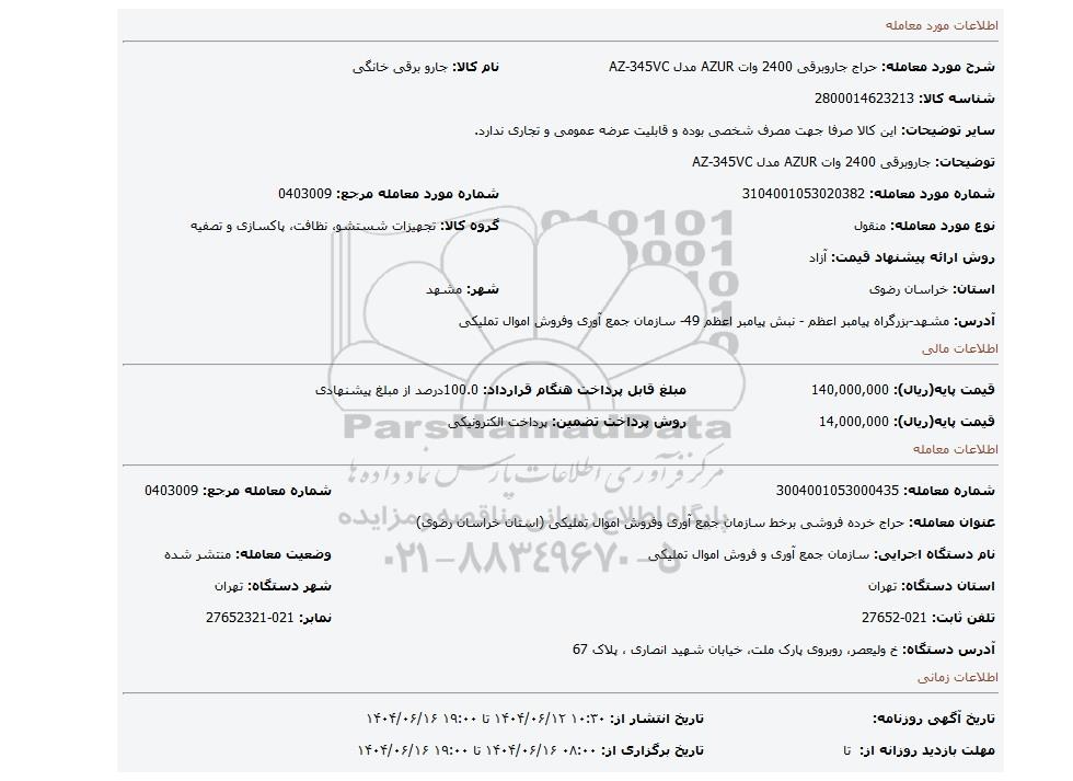 مزایده عمومی مزایده جاروبرقی 2400 وات AZUR مدل AZ-345VC برگزار میگردد. از کلیه افراد متخصص و شرکت‌های واجد شرایط دعوت به عمل می‌آید تا در این مزایده با کد خبرگزاری پارس نماد : 9495380 شرکت نمایند تاریخ شروع مزایده : 1404/06/12 مهلت شرکت در مزایده: تا پایان روز 1404/06/16 مکان برگزاری اموال واگذاری استان‌های خراسان رضوی و دسته‌بندی‌های مربوط به این حراجی متفرقه میباشد.