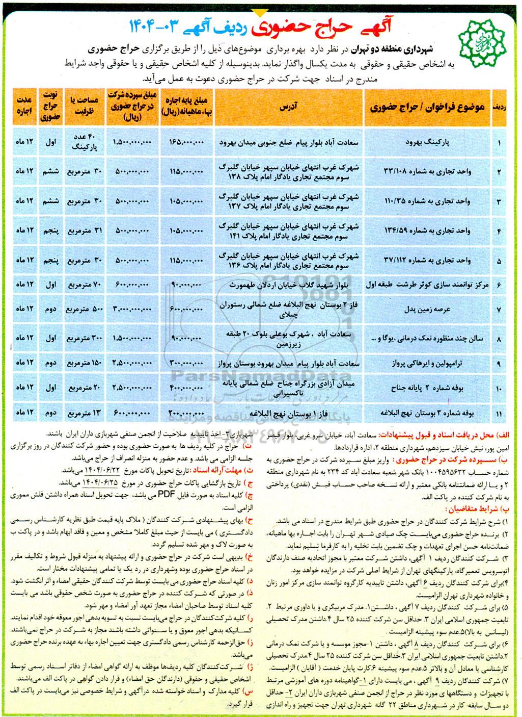 شهرداری منطقه دو تهران در نظر دارد بهره برداری موضوع های ذیل را از طریق برگزاری حراج حضوری به اشخاص حقیقی و حقوقی به مدت یکسال واگذار نماید. بدینوسیله از کلیه اشخاص حقیقی و یا حقوقی واجد شرایط مندرج در اسناد جهت شرکت در حراج حضوری دعوت به عمل می آید.