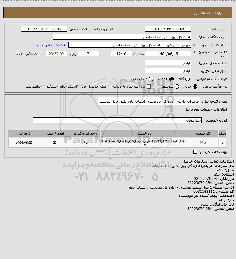شرح کلی نیاز: تعمیرات داخلی اداره کل بهزیستی استان ایلام طبق فایل پیوست