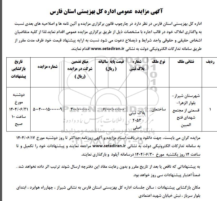 | 1 | شهرستان شیراز- بلوار الزهرا- قسمتی از مجتمع شهدای فتح المبين | ساختمان | پلاک ثبتی 2053 اصلی | 6.000.000.000 | 300.000.000 | 5004000150000009 | دوشنبه مورخ 1404.06.31 ساعت 10 صبح |