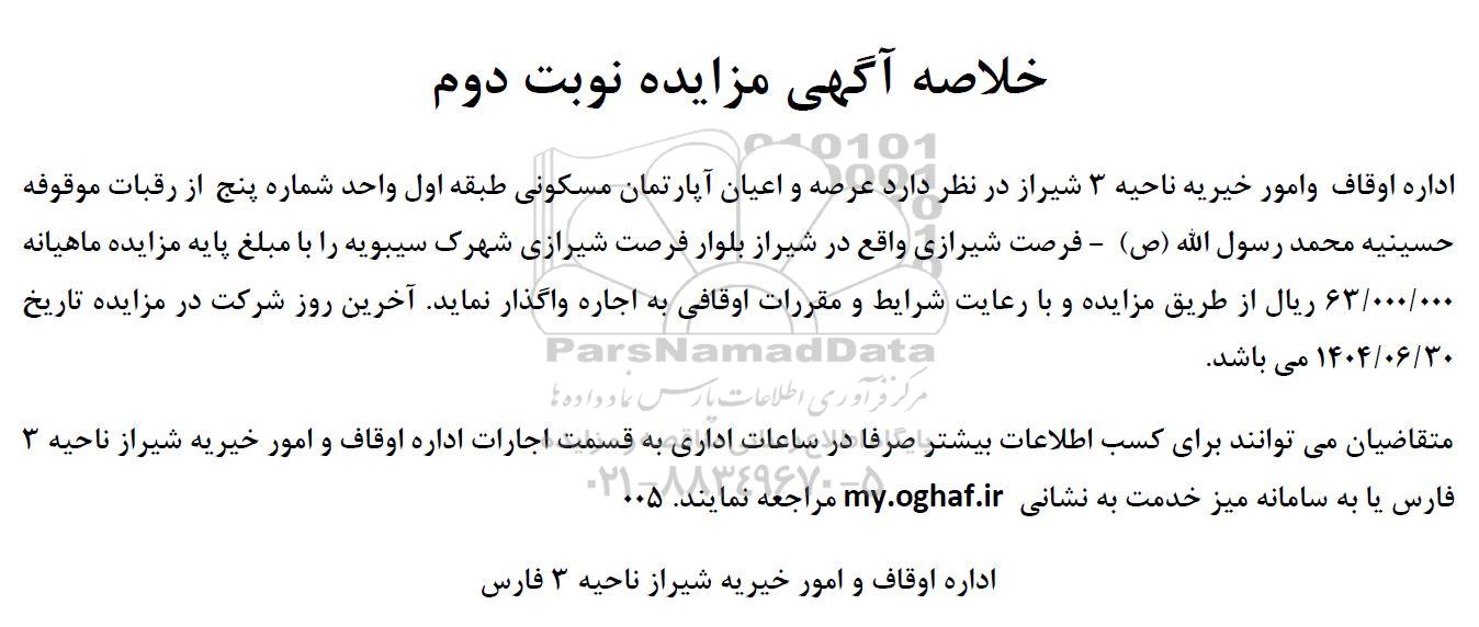 اداره اوقاف و امور خیریه ناحیه 3 شیراز در نظر دارد عرصه و اعیان آپارتمان مسکونی طبقه اول واحد شماره پنج از رقبات موقوفه حسینیه محمد رسول الله (ص) - فرصت شیرازی واقع در شیراز بلوار فرصت شیرازی شهرک سیبویه را با مبلغ پایه مزایده ماهیانه 63.000.000 ریال از طریق مزایده و با رعایت شرایط و مقررات اوقافی به اجاره واگذار نماید آخرین روز شرکت در مزایده تاریخ 1404.06.30 می باشد.