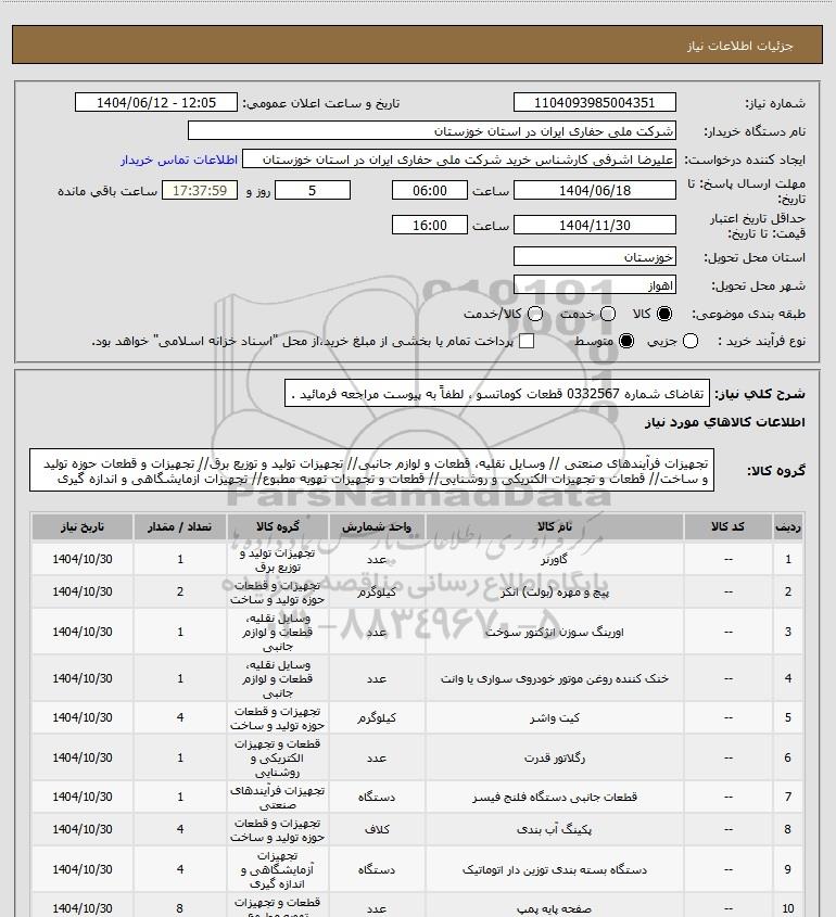 شرح کلی نیاز: تقاضای شماره 0332567 قطعات کوماتسو ، لطفاً به پیوست مراجعه فرمائید .