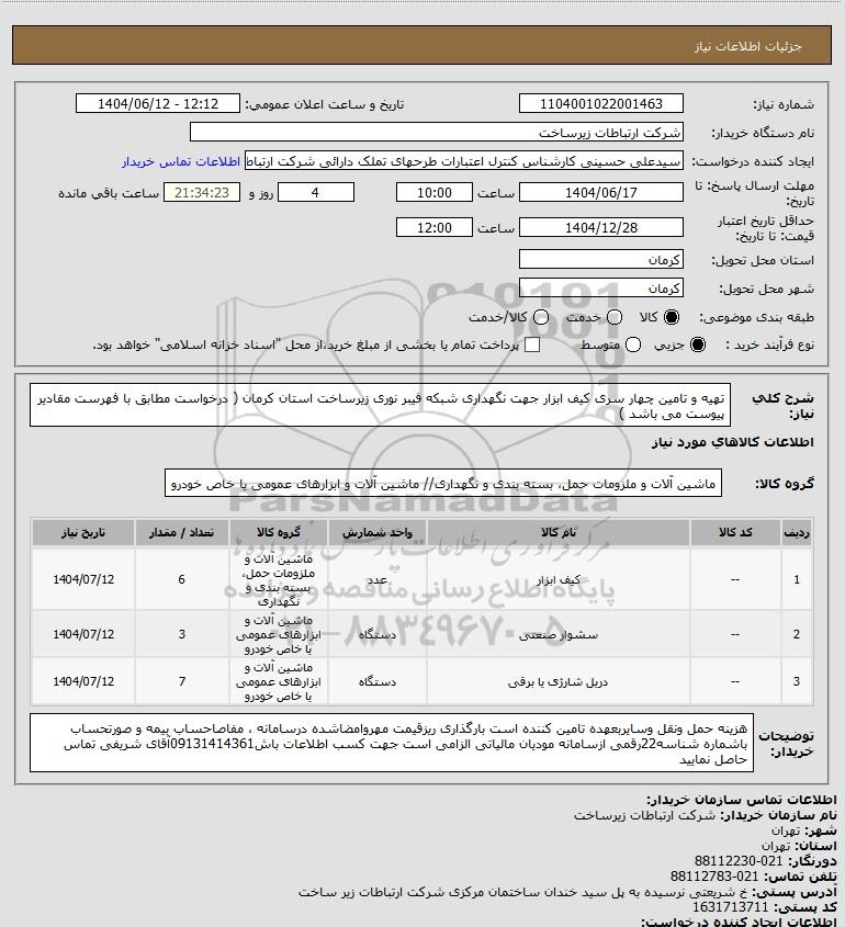 شرح کلی نیاز: تهیه و تامین چهار سری کیف ابزار جهت نگهداری شبکه فیبر نوری زیرساخت استان کرمان ( درخواست مطابق با فهرست مقادیر پیوست می باشد )