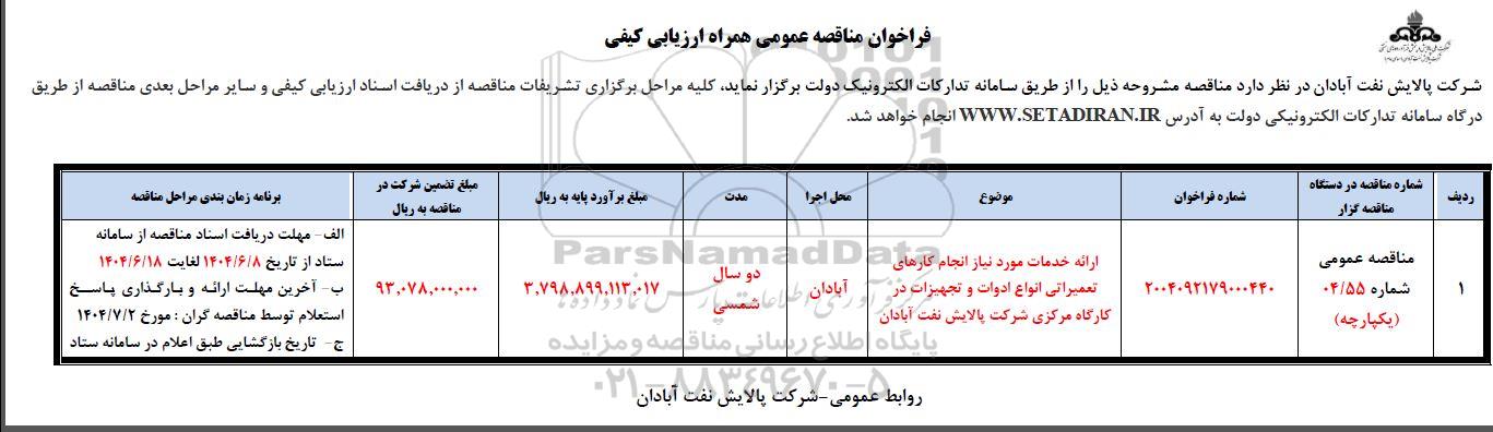 2004092179000440  ارائه خدمات موردنیاز انجام کارهای تعمیراتی انواع ادوات و تجهیزات در کارگاه مرکزی شرکت پالایش نفت آبادان آبادان دو سال شمسی 3.798.899.113.017 93.078.000.000