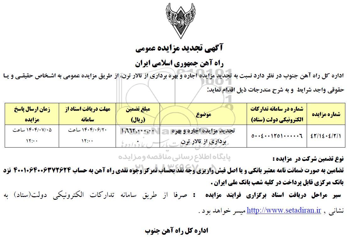 اداره کل راه آهن جنوب در نظر دارد نسبت به تجدید مزایده اجاره و بهره برداری از تالار ترن از طریق مزایده عمومی به اشخاص حقیقی یا حقوقی واجد شرایط و به شرح مندرجات ذیل اقدام نماید: