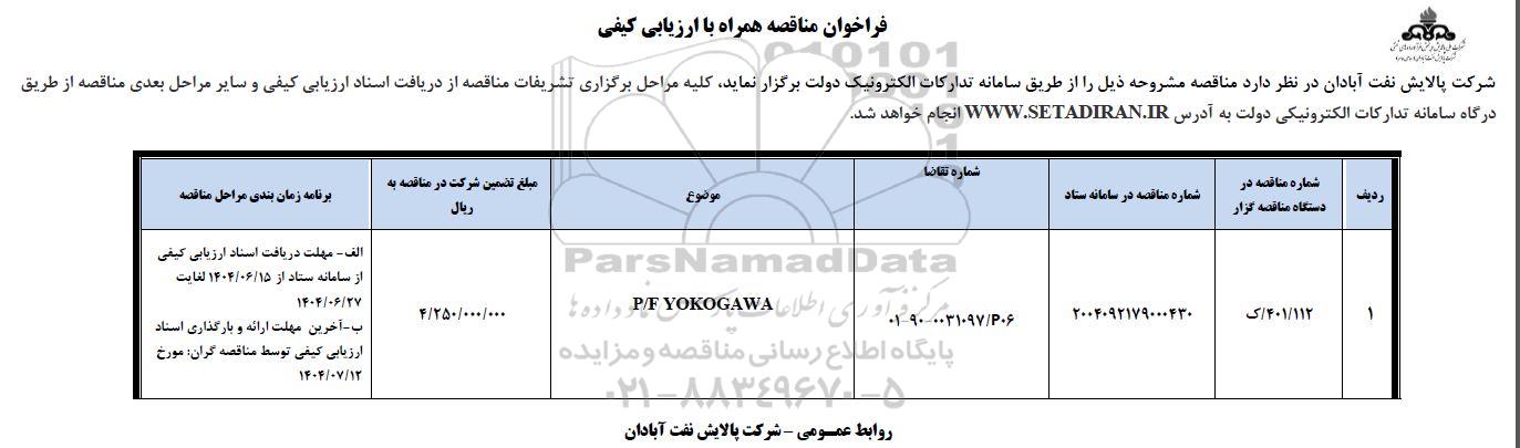 | 1 | 401/112/ک | 2004092179000430 | 01-90-0031097/P06 | P/F YOKOGAWA | 4.250.000.000 | الف - مهلت دریافت اسناد ارزیابی کیفی از سامانه ستاد از 1404.06.15 لغایت 1404.06.27 ب- آخرین مهلت ارائه و بارگذاری اسناد ارزیابی کیفی توسط مناقصه گران مورخ 1404.07.12 |