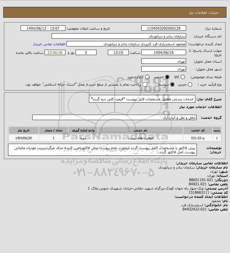 شرح کلی نیاز: خدمات پستی مطابق مشخصات فایل پیوست *قیمت کلی درج گردد*