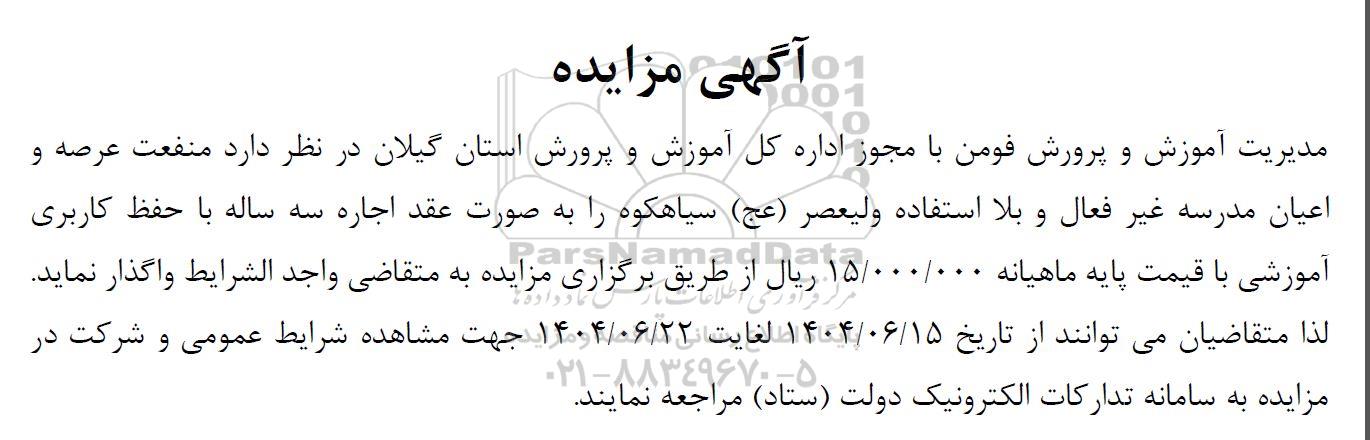 مدیریت آموزش و پرورش فومن با مجوز اداره کل آموزش و پرورش استان گیلان در نظر دارد منفعت عرصه و اعیان مدرسه غیر فعال و بلا استفاده ولیعصر (عج) سیاهکوه را به صورت عقد اجاره سه ساله با حفظ کاربری آموزشی با قیمت پایه ماهیانه 15.000.000 ریال از طریق برگزاری مزایده به متقاضی واجد الشرایط واگذار نماید. لذا متقاضیان می توانند از تاریخ 1404.6.15 لغایت 1404.6.22 جهت مشاهده شرایط عمومی و شرکت در مزایده به سامانه تدارکات الکترونیک دولت (ستاد ) مراجعه نمایند.