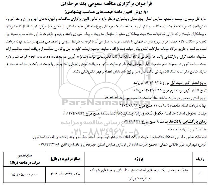 اداره کل نوسازی، توسعه و تجهیز مدارس استان چهارمحال و بختیاری در نظر دارد بر اساس قانون برگزاری مناقصات و آئین نامه های اجرایی آن و مطابق با دستور العمل تعیین دامنه قیمت های متناسب پیشنهادی در مناقصات یک مرحله ای پروژه احداثی مدرسه استان را به شرح ذیل برگزار نماید. لذا از کلیه شرکتها و پیمانکاران ذیصلاح که دارای گواهینامه صلاحیت پیمانکاری معتبر از سازمان مدیریت و برنامه ریزی باشند و پایه و ظرفیت خالی متناسب و همچنین تجربه و امکانات لازم جهت اجرای پروژه های ساختمانی را دارند دعوت به عمل می آید با توجه به شرایط عمومی و اختصاصی مندرج در اسناد، جهت دریافت اسناد مناقصه از طریق درگاه سامانه تدارکات الکترونیکی دولت (ستاد) اقدام نمایند. توضیح اینکه کلیه مراحل برگزاری مناقصه از دریافت اسناد مناقصه ارائه پیشنهاد مناقصه گران و بازگشایی پاکت ها از طریق درگاه سامانه تدارکات الکترونیکی دولت (ستاد) به آدرس سایت ستاد ایران انجام خواهد شد و لازم است مناقصه گران در صورت عدم عضویت قبلی مراحل ثبت نام در سایت مذکور و دریافت گواهی امضای الکترونیکی را جهت شرکت در مناقصه محقق سازند. شایان ذکر است اسناد الکترونیکی پاکتهای (ب) و (ج) باید دارای امضاء و مهر الکترونیکی باشند.