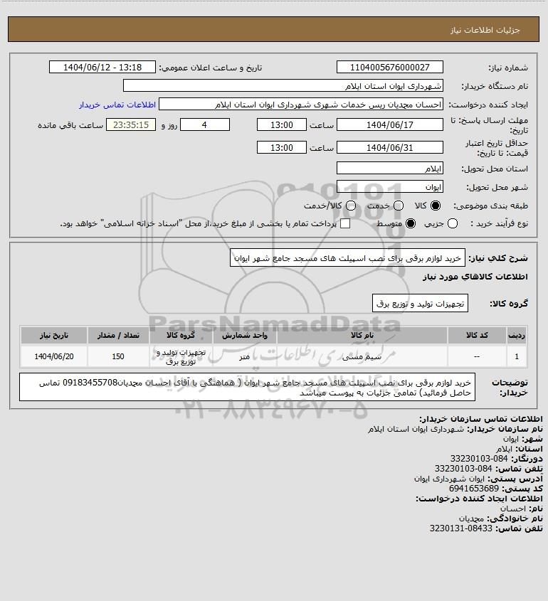 شرح کلی نیاز: خرید لوازم برقی برای نصب اسپیلت های مسجد جامع شهر ایوان
