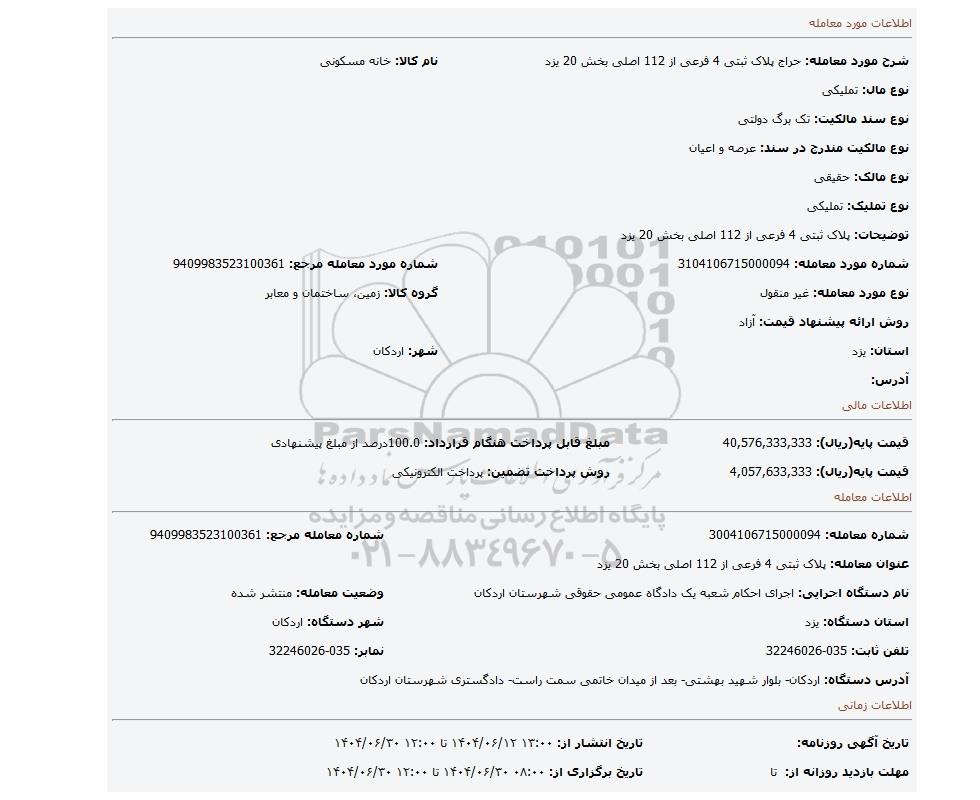 مزایده پلاک ثبتی 4 فرعی از 112 اصلی بخش 20 یزد, مزایده، پلاک ثبتی 4 فرعی از 112 اصلی بخش 20 یزد