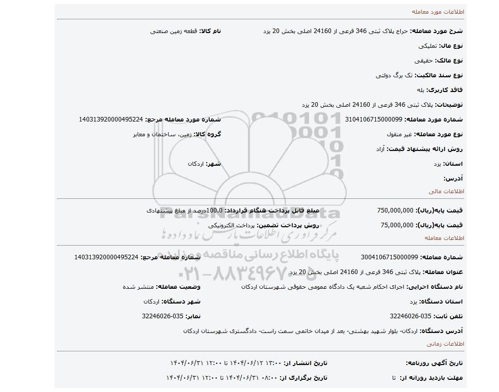 عنوان معامله: پلاک ثبتی 346 فرعی از 24160 اصلی بخش 20 یزد