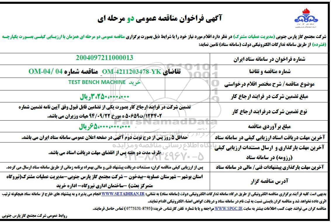 موضوع مناقصه / شرح مختصر اقلام درخواستی : خرید TEST BENCH MACHINE