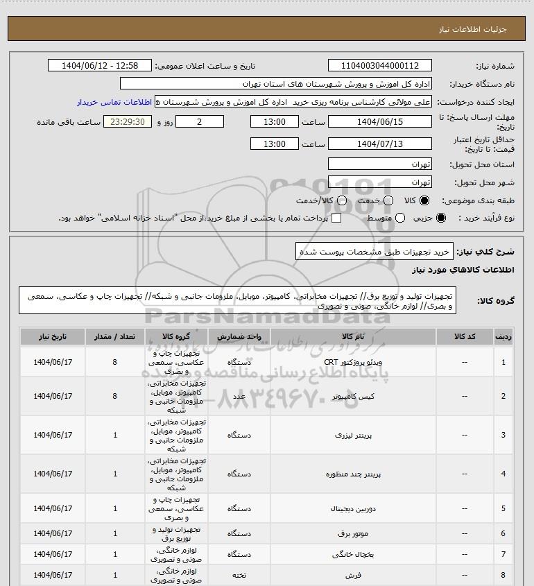 نام دستگاه خریدار:اداره کل اموزش و پرورش شهرستان های استان تهران
