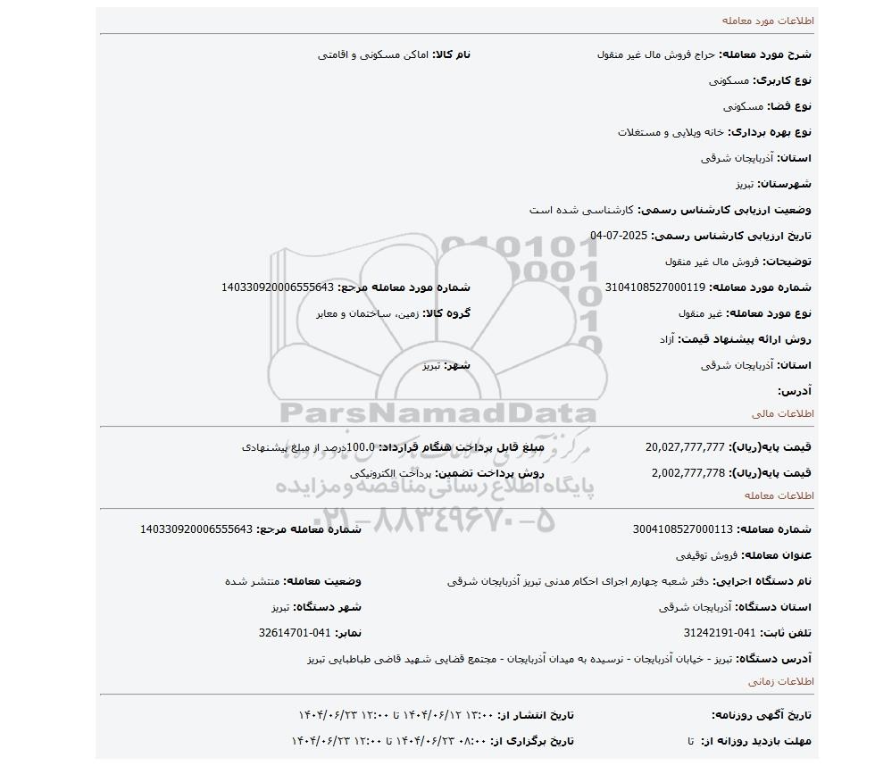 | شرح مورد معامله: حراج فروش مال غیر منقول | نام کالا: اماکن مسکونی و اقامتی | |