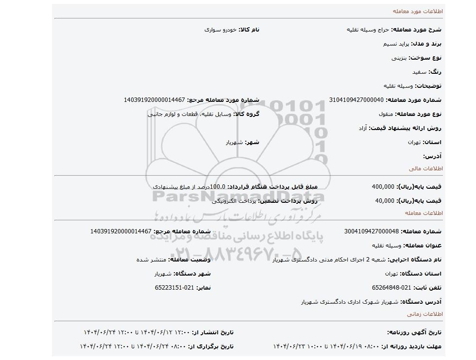 | نوع مورد معامله: منقول | گروه کالا: وسایل نقلیه، قطعات و لوازم جانبی | |