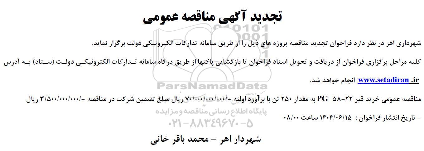برای شرکت در مناقصه حتما از تصویر آگهی در سایت پارس نماد داده ها استفاده نمایید