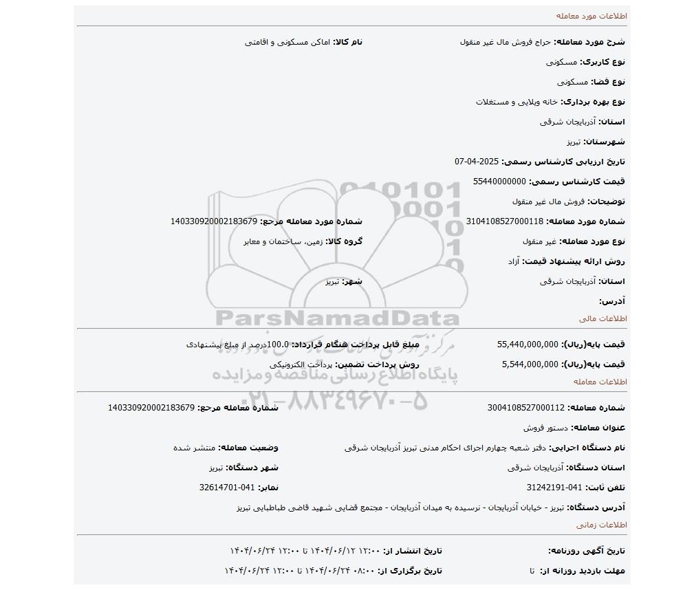 | شرح مورد معامله: حراج فروش مال غیر منقول | نام کالا: اماکن مسکونی و اقامتی | |