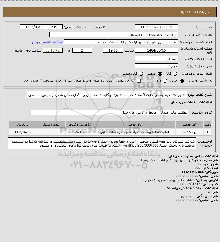شرح کلی نیاز: شهرداری خرم آباد- واگذاری 9 ماهه خدمات اشپزی و کارهای خدماتی و اتاقداری هتل شهرداری بصورت حجمی