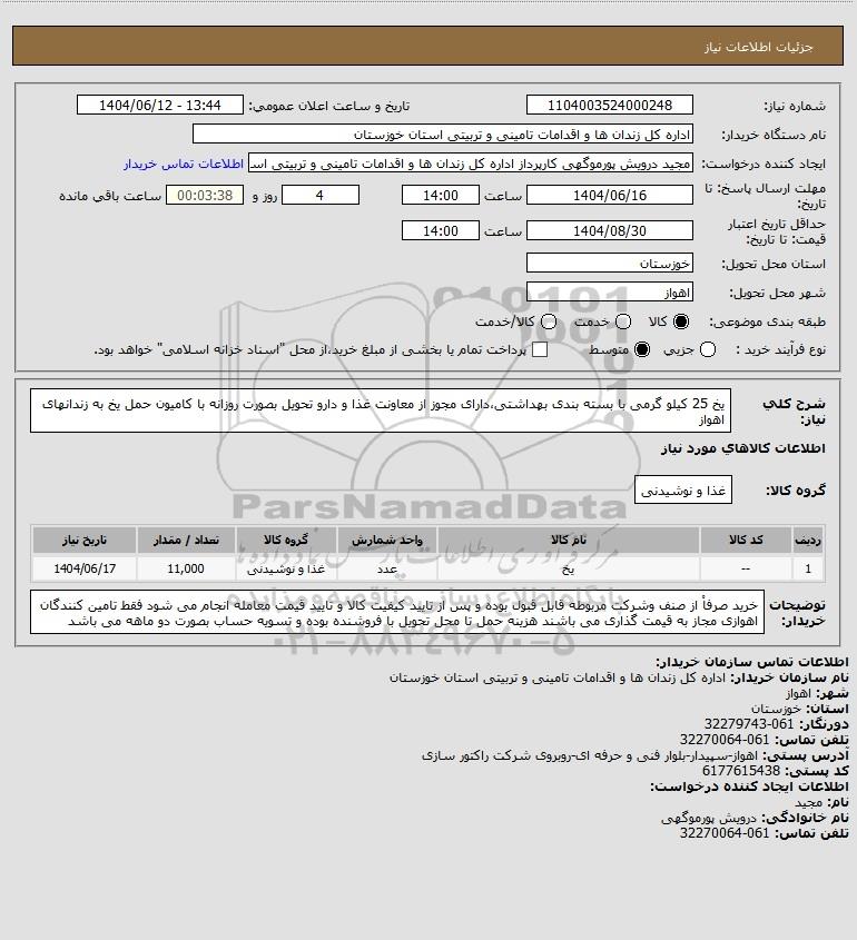 شرح کلی نیاز: یخ 25 کیلو گرمی با بسته بندی بهداشتی،دارای مجوز از معاونت غذا و دارو تحویل بصورت روزانه با کامیون حمل یخ به زندانهای اهواز