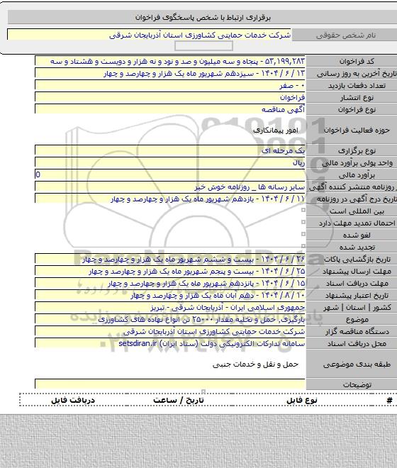 این مناقصه در استان آذربایجان شرقی با دسته بندی های صنفی و تخصصی انبارداری, تامین نیروی انسانی, تجهیزات و خدمات کشاورزی و دامپروری, حمل و نقل جاده ای برگزار میشود.
