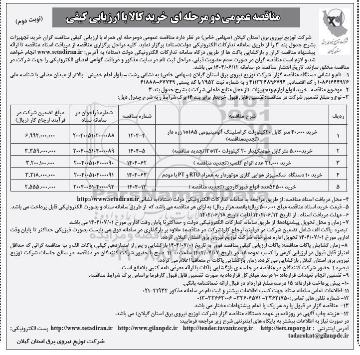 شرکت توزیع نیروی برق استان گیلان (سهامی خاص) در نظر دارد مناقصه عمومی دو مرحله ای همراه با ارزیابی کیفی مناقصه گران خرید تجهیزات بشرحبرق جدول بند 3 را از طریق سامانه تدارکات الکترونیکی دولت ستاد برگزار نماید. کلیه مراحل برگزاری مناقصه از دریافت اسناد مناقصه تا ارائه پیشنهاد مناقصه گران و بازگشایی پاکت ها از طریق درگاه سامانه تدارکات الکترونیکی دولت (ستاد) به آدرس سایت ستاد ایران انجام خواهد شد و لازم است مناقصه گران در صورت عدم عضویت قبلی مراحل ثبت نام در سایت مذکور و دریافت گواهی امضای الکترونیکی را جهت شرکت در مناقصه محقق سازند.