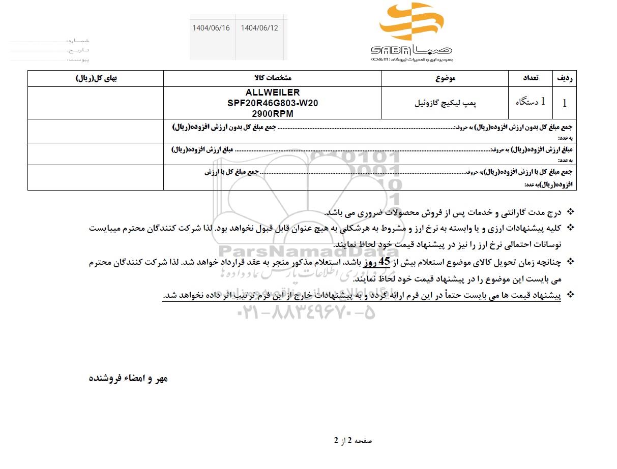 استعلام بها و موضوع استعلام استعلام پمپ لیکیج گازوئیل به اطلاع کلیه شرکتها و افراد متخصص واجد شرایط میرساند، آگهی گذار در نظر دارد از طریق استعلام بها، نسبت به انتخاب و دریافت پیشنهادات اقدام نماید. این استعلام با کد آگهی ثبت شده در سامانه خبرگزاری پارس نماد : 9497331 منتشر شده است. مشخصات استعلام : تاریخ شروع استعلام: 1404/06/12 آخرین مهلت ارسال پیشنهاد قیمت : 1404/06/16 و محل اجرای پروژه : استان سایر میباشد. استعلام قیمت مورد درخواست : استعلام پمپ لیکیج گازوئیل با دستهبندیهای تخصصی و گروه های مرتبط : الکتروموتور و پمپ های شناور, نیروگاه, تجهیزات برق و الکترونیک, استعلام اطلاع رسانی میگردد. شرایط شرکت در استعلام آنلاین : ابتدا ثبت نام در سامانه استعلام پارس نماد و تکمیل مدارک موردنیاز و بارگذاری در سامانه رعایت تمامی ضوابط و الزامات مندرج در اسناد استعلام است.
