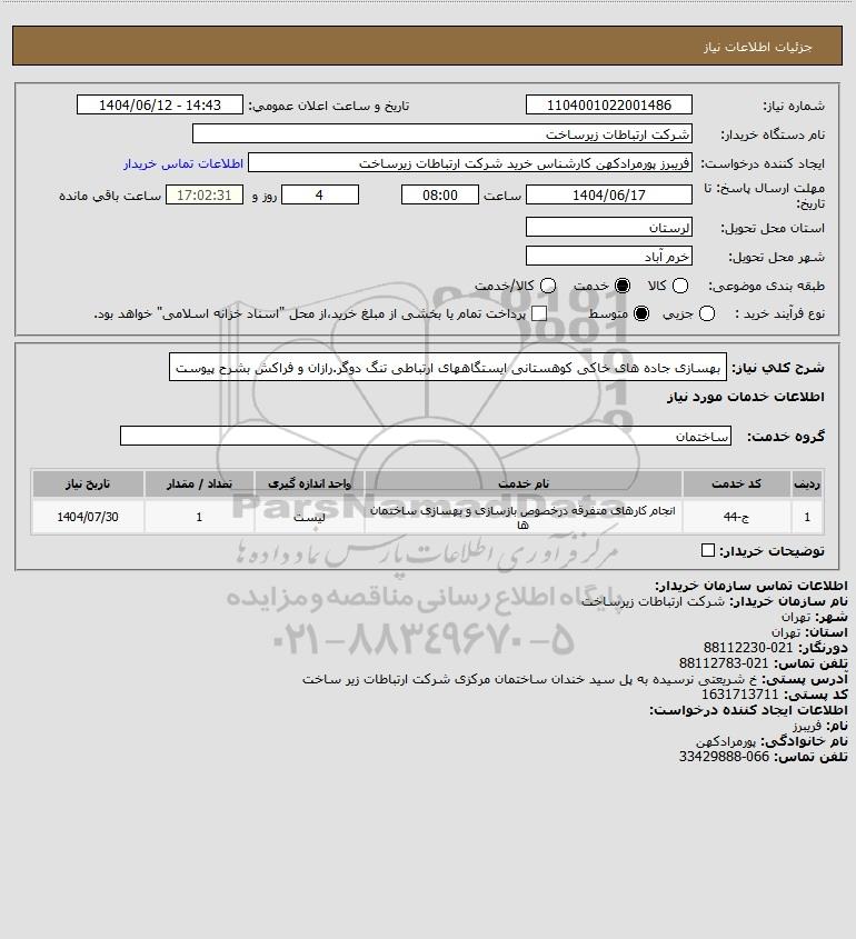 شرح کلی نیاز: بهسازی جاده های خاکی کوهستانی ایستگاههای ارتباطی تنگ دوگر.رازان و فراکش بشرح پیوست