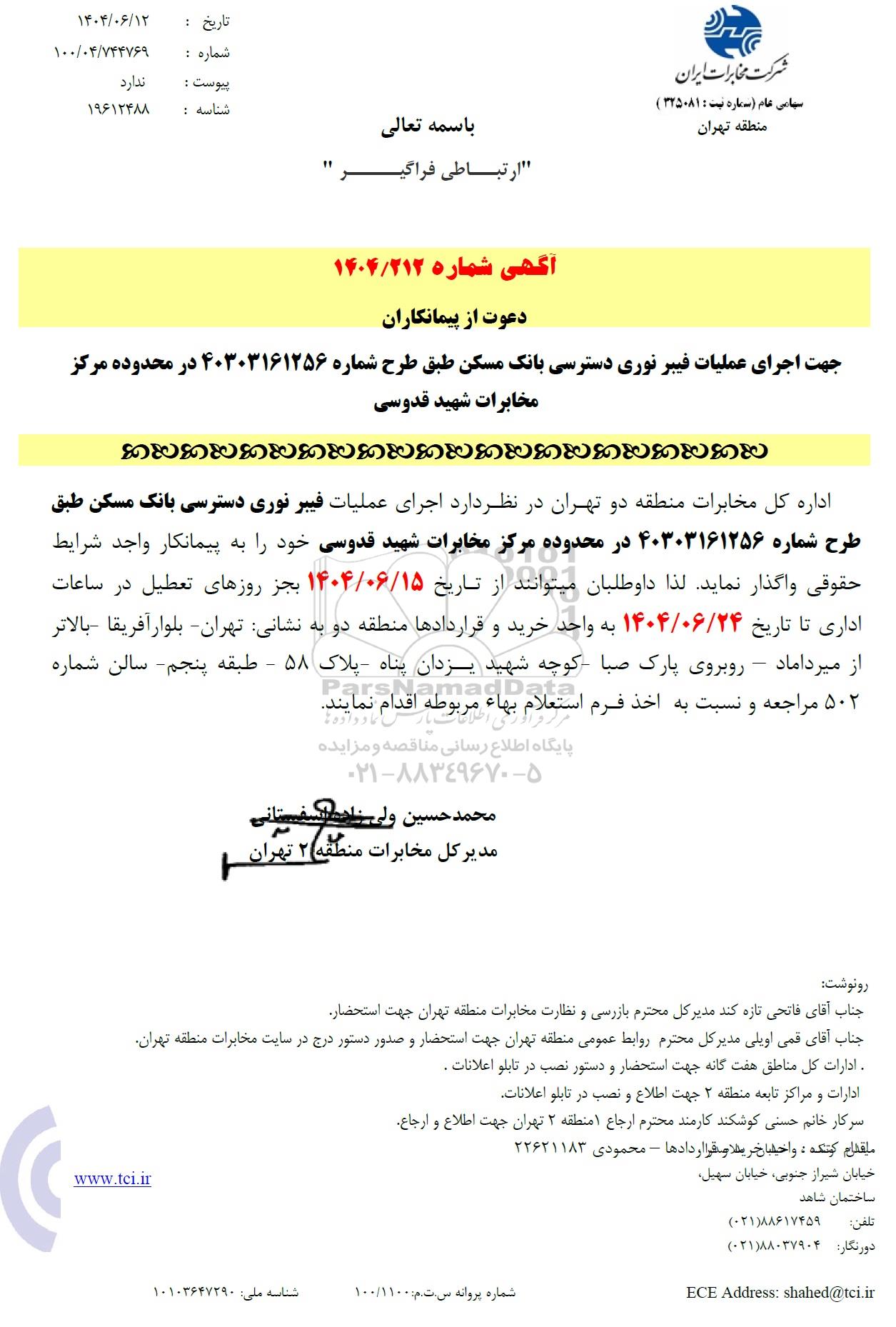 اداره کل مخابرات منطقه دو تهران در نظر دارد اجرای عملیات فیبر نوری دسترسی بانک مسکن طبق طرح شماره 40303161256 در محدوده مرکز مخابرات شهید قدوسی خود را به پیمانکار واجد شرایط حقوقی واگذار نماید لذا داوطلبان میتوانند از تاریخ 1404.6.15 بجز روزهای تعطیل در ساعات اداری تا تاریخ 1404.6.24 به واحد خرید و قراردادها منطقه دو به نشانی تهران - بلوار آفریقا - بالاتر از میرداماد - روبروی پارک صبا کوچه شهید یزدان پناه - پلاک 58 - طبقه پنجم سالن شماره 502 مراجعه و نسبت به اخذ فرم استعلام بهاء مربوطه اقدام نمایند.