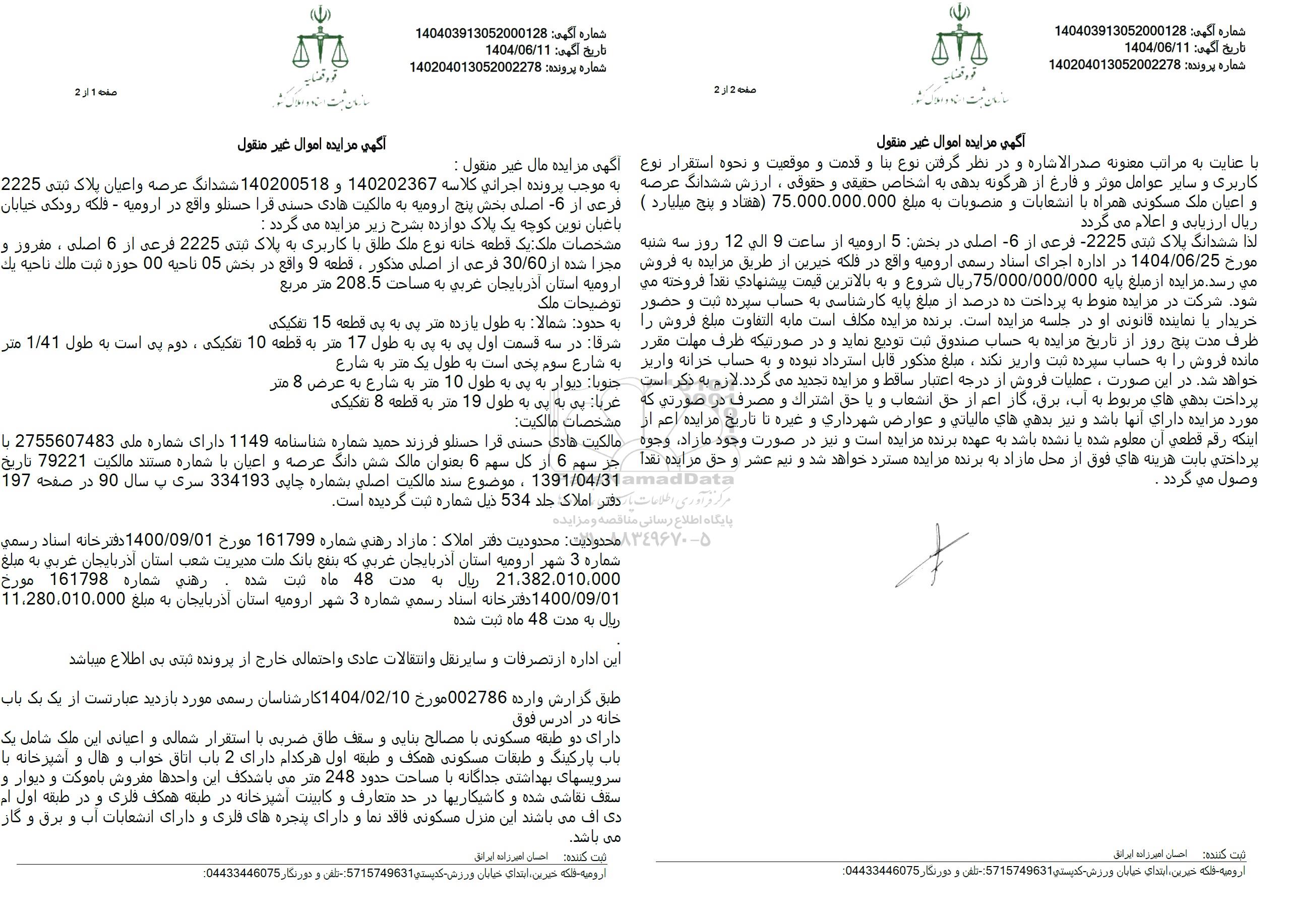 مزایده فروش ملک به پلاک ثبتی 2225 فرعی از 6 اصلی به مس احت 208.5 مترمربع