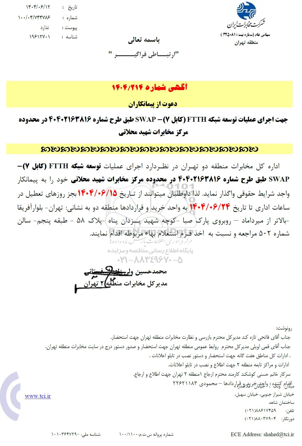 اداره کل مخابرات منطقه دو تهران در نظر دارد اجرای عملیات توسعه شبکه FTTH (کابل 7) طبق طرح شماره 40402163816 در محدوده مرکز مخابرات شهید محلاتی خود را به پیمانکار واجد شرایط حقوقی واگذار نماید. لذا داوطلبان میتوانند از تاریخ 1404.06.15 بجز روزهای تعطیل در ساعات اداری تا تاریخ 1404.06.24 به واحد خرید و قراردادها منطقه دو به نشانی : تهران بلوار آفریقا بالاتر از میرداماد روبروی پارک صبا کوچه شهید یزدان پناه پلاک 58 - طبقه پنجم سالن شماره 502 مراجعه و نسبت به اخذ فرم استعلام بهاء مربوطه اقدام نمایند.